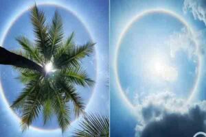 “இதனால் அங்குள்ள நீர் சிறிய பனித்துகளாக மாறி, சூரிய ஒளியை இவ்வாறு திரிபடைய செய்து வெளிப்படுத்துகிறது. அவை சூரியனை சுற்றி வெள்ளை வட்டத்தை ஏற்படுவதனை அவதானிக்க முடியும்” எனத் தெரிவித்துள்ளார். (படங்கள்: சமூக வலைத்தளம்)