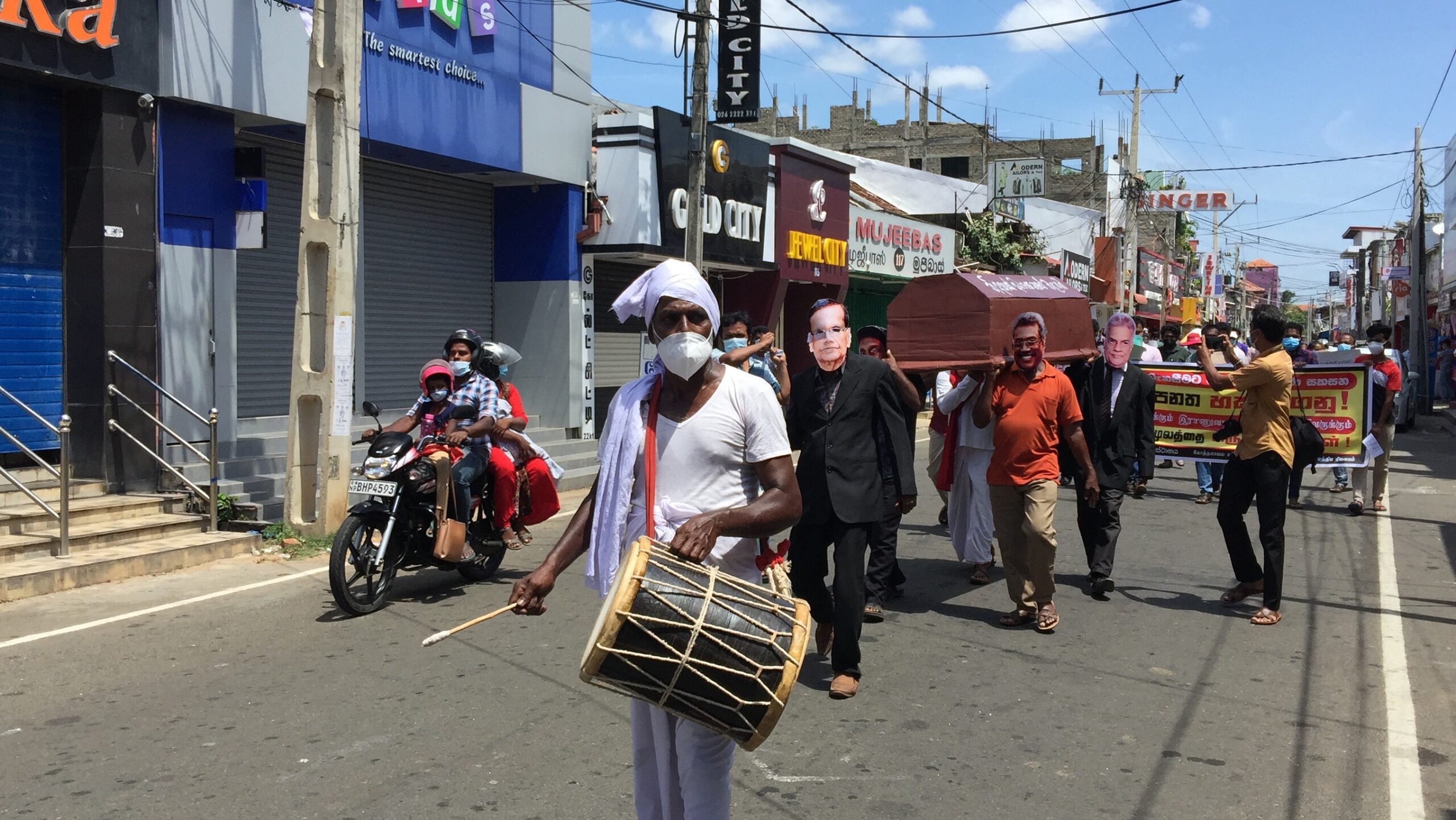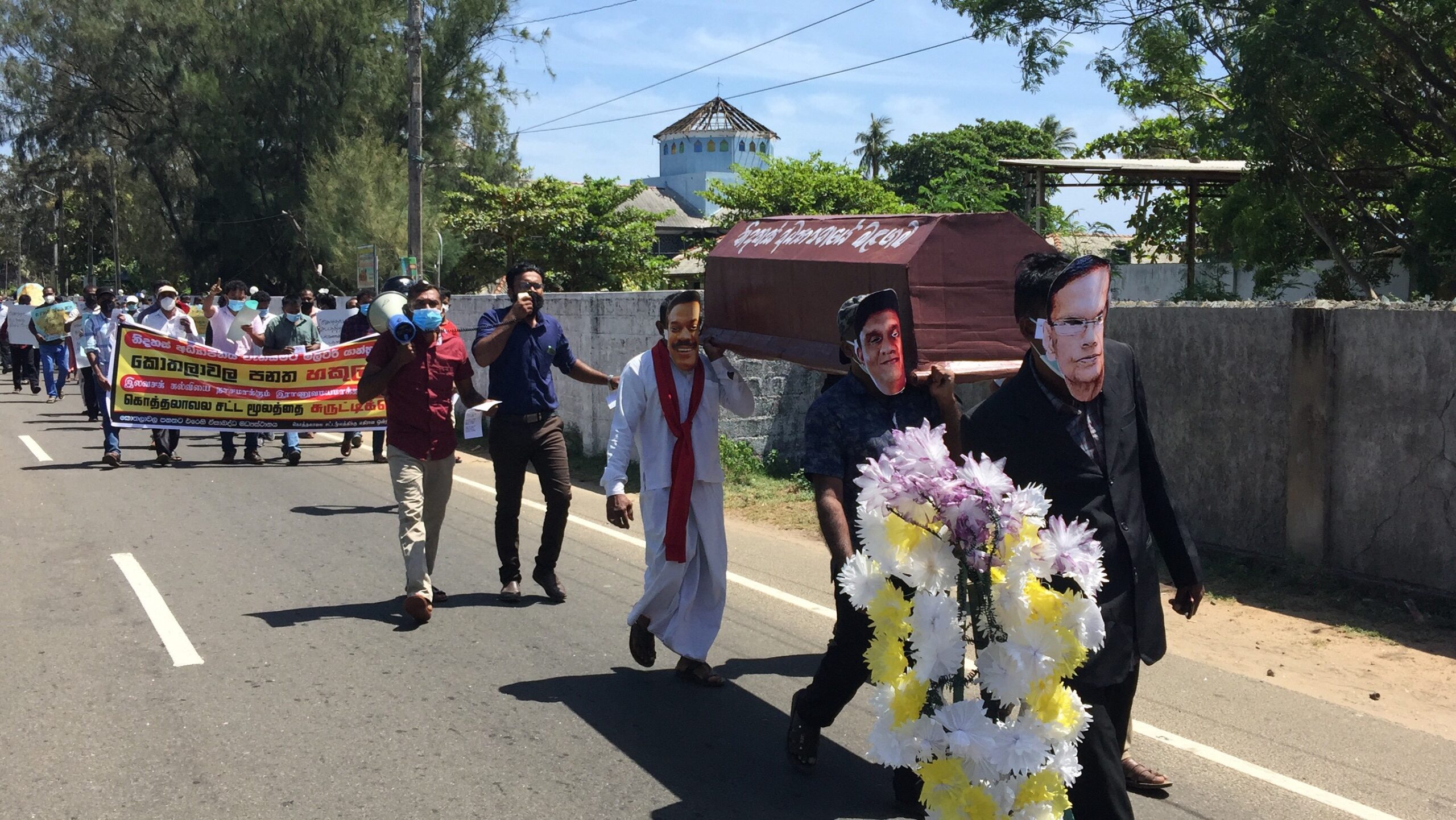 நாட்டின் தலைவர்களது முக கூடிகளையும் அவர்களது ஆடைகளைக் குறிக்கும் வகையில் வேடமிட்ட சிலர் பிரேதப் பெட்டி ஒன்றினை ஏந்தியவாறு குறித்த ஆர்ப்பாட்டத்தில் ஈடுபட்டமை அனைவரது கவனத்தையும் ஈர்த்தது.