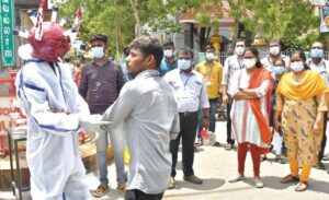 கரோனா வைரஸ் போன்ற வேடமணிந்த நபர் சாலையில் முகக்கவசம் அணியாமல் சென்றவர்களை துரத்தி பிடித்து முகக்கவசம் வழங்கி விழிப்புணர்வு ஏற்படுத்தினார். மாநகராட்சி ஆணையர் தி.சாரு நிகழ்ச்சியை தொடங்கி வைத்தார்.