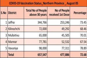 இதன்படி யாழ். மாவட்டத்தில் 344,766 பேருக்கும் கிளிநொச்சி மாவட்டத்தில் 72,000 பேருக்கும் முல்லைத்தீவு மாவட்டத்தில் 65,000 பேருக்கும் மன்னார் மாவட்டத்தில் 77,781 பேருக்கும் வவுனியா மாவட்டத்தில் 98,000 பேருக்கும் ஆக வட மாகாணத்தில் மொத்தமாக 657,547 தடுப்பூசிகள் வழங்கப்பட்டதாகவும் தெரிவிக்கப்படுகின்றது.