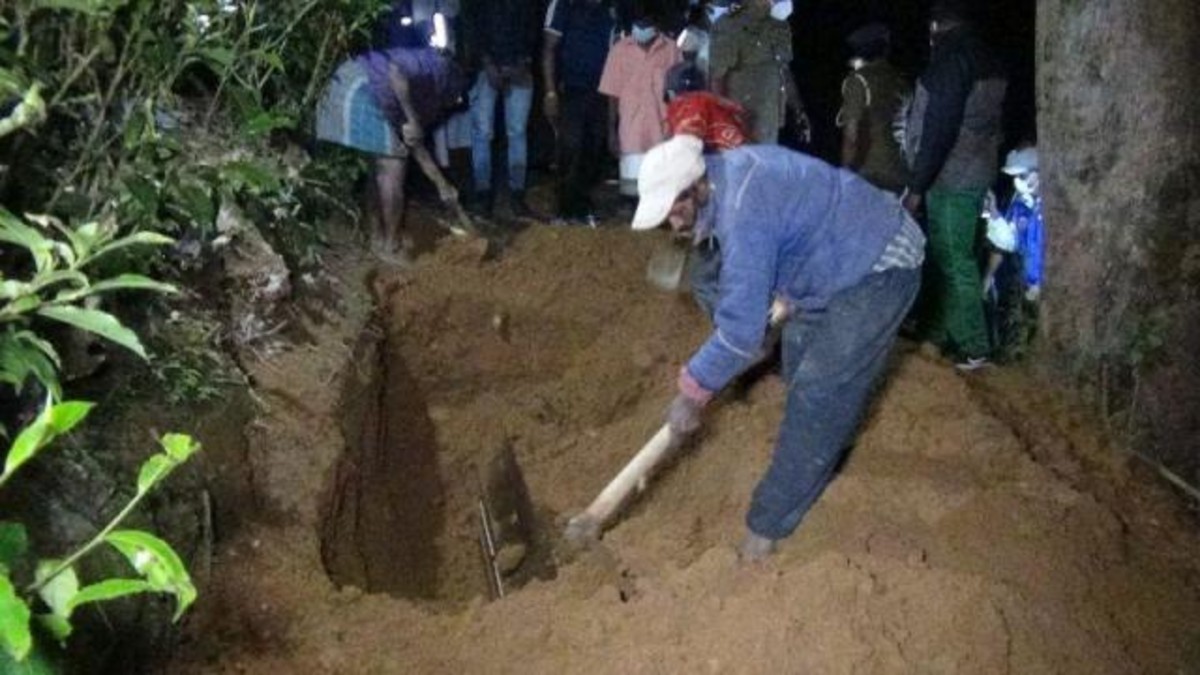 குழியை தோண்டும் நடவடிக்கை தொடர்ந்த நிலையில் பகல் 12.20 மணிக்கு சிறுமி உடல் அடங்கிய பேழை எவ்வாறு இரண்டு கயிறுகள் இட்டு குழிக்குள் இறக்கப்பட்டதோ அதேபோல் கயிறிடப்பட்டு பேழையில் ஒட்டிய மண் தட்டப்பட்டு மேலே எடுத்து மேசை ஒன்றில் வைக்கப்பட்டது.