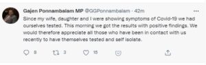 தனது டுவிட்டரில் பதிவொன்றை இட்டுள்ள கஜேந்திரகுமார் பொன்னம்பலம், தனக்கும், தனது மனைவி மற்றும் மகளுக்கு கொரோனா வைரஸ் தொற்றியிருப்பது உறுதிப்படுத்தப்பட்டுள்ளது.