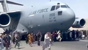 அமெரிக்க விமானம் புறப்பட்ட சமயத்தில் நூற்றுக்கணக்கான ஆப்கானியர்கள் விமானத்தைச் சுற்றிவளைத்து அதில் ஏற முயற்சித்தனர். பலர் விமான சக்கர பகுதியில் அமர்ந்து ஆபத்தான பயணம் மேற்கொண்டனர். விமானம் புறப்பட்ட சில நிமிடங்களில் விமானத்தின் சக்கர பகுதியில் அமர்ந்திருந்தவர்களில் சிலர் விமானத்தில் இருந்து கீழே விழுந்து உயிரிழந்தனர்.