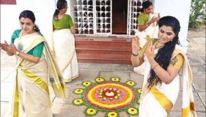 வீட்டு வரவேற்பறையிலும் மலர்களால் அத்தப்பூ கோலம் போட்டு, அதன் நடுவில் குத்துவிளக்கு ஏற்றி பழங்கள் காய்கறிகளை வைத்து வணங்குவார்கள். தொடர்ந்து