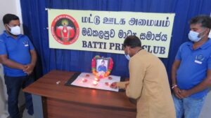 மட்டக்களப்பு தமிழ் ஊடகவியலாளர் ஒன்றிய தலைவர் பா.கிருஷ்ணகுமார் தலைமையில் இடம்பெற்ற இந்த அஞ்சலி செலுத்தும் நிகழ்வில் ஊடகவியலாளர்கள் கலந்து கொண்டு உயிரிழந்த ஊடகவியலாளரின் திருவுருவ படத்திற்கு சுடர்ஏற்றி ஆத்மா சாந்தியடைய வேண்டி இரண்டு நிமிட மௌன அஞ்சலி செலுத்தினர்.