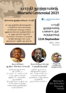 புலம்பெயர் தேசங்களில் பாரதி நூற்றாண்டு Posted on September 7, 2021 at September 7, 2021 by தென்னவள் 418 0 பாரதி நூற்றாண்டு -ZOOM 11-09- 2021 – காலை -10.00 மணி ( சிங்கப்பூர் நேரம்)