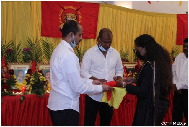 தொடர்ந்து தமிழீழத் தேசியக்கொடியினை மாவீரர் குடும்பத்தினரிடம் கையளிக்கும் நிகழ்வு இடம்பெற்றது. பிரான்சு தமிழர் ஒருங்கிணைப்பு குழுப் பொறுப்பாளர் தேசியக் கொடியை கையளித்திருந்தார்.