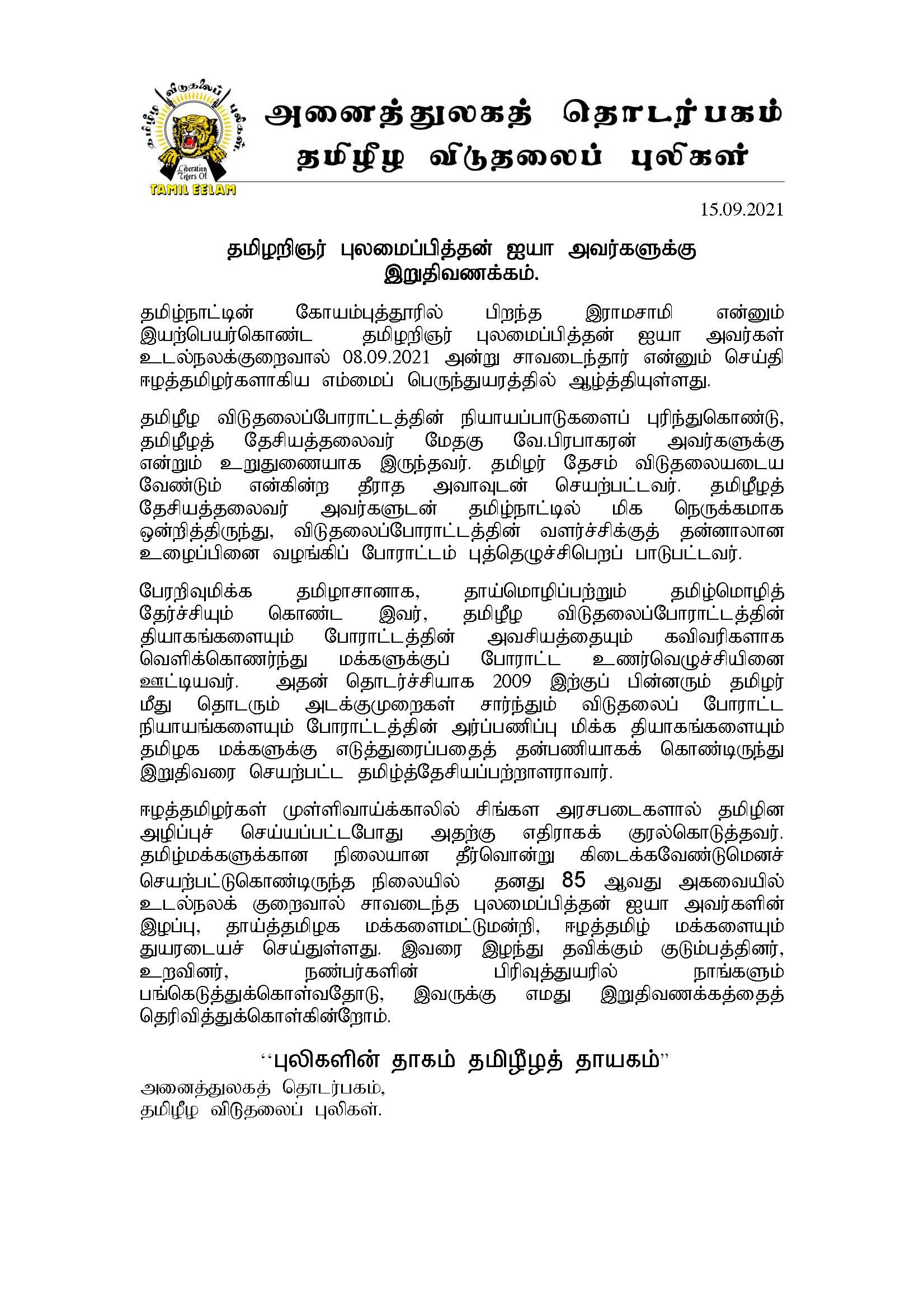 தமிழ்நாட்டின் கோயம்புத்தூரில் பிறந்த இராமசாமி என்னும் இயற்பெயர்கொண்ட தமிழறிஞர் புலமைப்பித்தன் ஐயா அவர்கள் உடல்நலக்குறைவால் 08.09.2021 அன்று சாவடைந்தார் என்னும் செய்தி ஈழத்தமிழர்களாகிய எம்மைப் பெருந்துயரத்தில் ஆழ்த்தியுள்ளது.