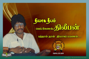 இந்திய மண்ணில் என்றோ தோன்றி மறைந்துவிட்ட அந்த இரு சோதிகளும் அல்ல, உருவங்களும் வெகுநேரம் திலீபனைப்பார்க்க முடியாமல் வெட்கித் தலை குனிந்தவாறு சிறிது சிறிதாக என் கண்களை விட்டு மறைந்து கொண்டிருக்கின்றன…..