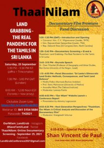 தாய்நிலம்: நில அபகரிப்பு – இலங்கை வாழ் தமிழ் மக்களின் உண்மையான பெருந்தொற்று – தமிழ் மக்கள் அனைவரும் தவறாமல் பார்க்கவேண்டிய ஆவண படம்தாய்நிலம்: நில அபகரிப்பு – இலங்கை வாழ் தமிழ் மக்களின் உண்மையான பெருந்தொற்று ( ThaaiNilam: Land Grabbing – The Real Pandemic for the Tamils in Sri Lanka) என்ற ஆவணப் படத்தின் திரையிடல் நிகழ்வுக்கு உங்கள் அனைவரையும் அழைப்பதில் பெரு மகிழ்ச்சி அடைகின்றேன். இந்த ஆவண படம் நீங்கள் முன்னர் ஒருபோதும் பார்த்திராத பல காட்சிகளையும், செவ்விகளையும் கொண்டிருக்கின்றது. இவை அனைத்தும் இலங்கையில் தமிழர் தாயகத்தில் ஆக்கிரமிக்கப்பட்ட பகுதிகளில் இருந்து நேரடியாக பதிவு செய்யப்பட்டவை ஆகும். இந்த ஆவண பட திரையிடல் நிகழ்வை தொடர்ந்து ‘இலங்கையின் இனஞ் சார்ந்த நில ஆக்கிரமிப்பு: முறைகள், விளைவுகள் மற்றும் தமிழ் நில பாதுகாப்பு’ ( Sri Lanka’s Ethnocratic Land Grabs: Methods, Consequences, and Tamil Land Defence ) என்ற இணையவழி கலந்துரையாடலும் இடம்பெறவுள்ளது.