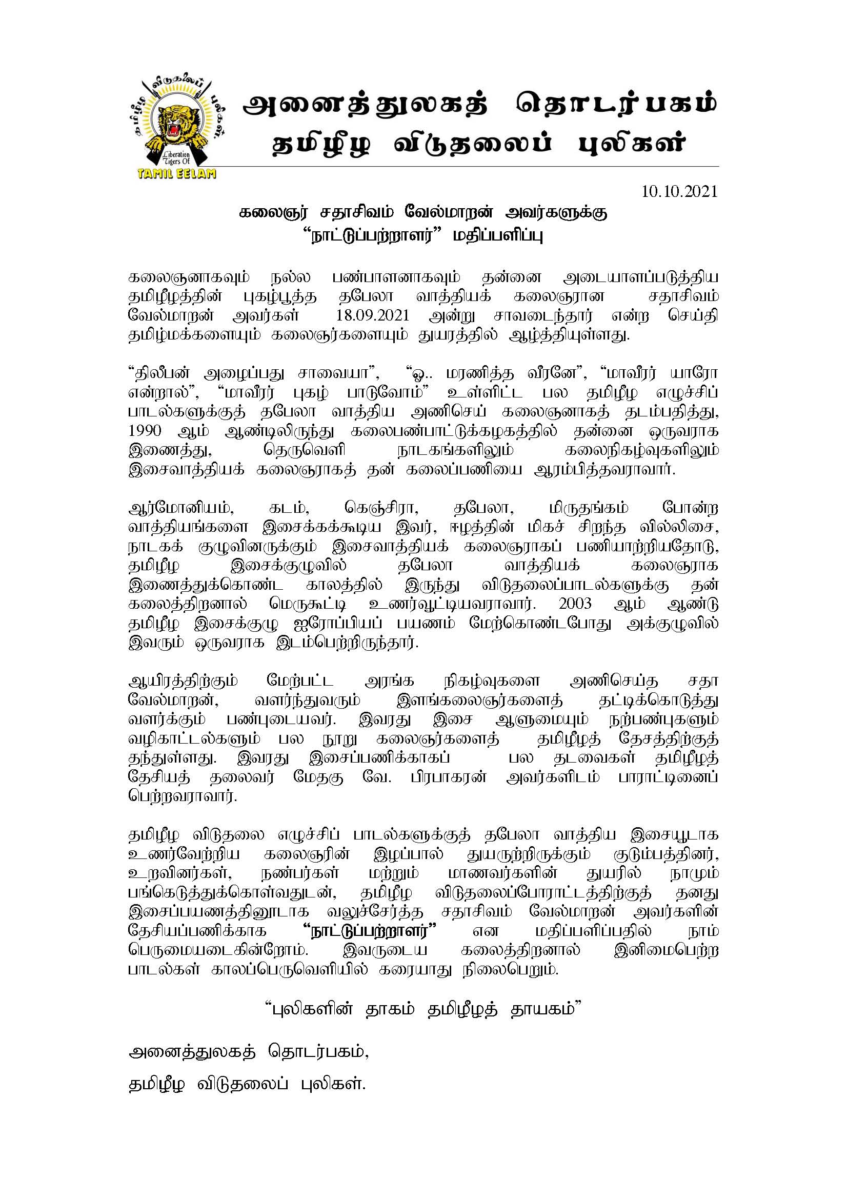 தமிழீழ விடுதலை எழுச்சிப் பாடல்களுக்குத் தபேலா வாத்திய இசையூடாக உணர்வேற்றிய கலைஞரின் இழப்பால் துயருற்றிருக்கும் குடும்பத்தினர், உறவினர்கள், நண்பர்கள் மற்றும் மாணவர்களின் துயரில் நாமும் பங்கெடுத்துக்கொள்வதுடன், தமிழீழ விடுதலைப்போராட்டத்திற்குத் தனது இசைப்பயணத்தினூடாக வலுச்சேர்த்த சதாசிவம் வேல்மாறன் அவர்களின் தேசியப்பணிக்காக“நாட்டுப்பற்றாளர்” என மதிப்பளிப்பதில் நாம் பெருமையடைகின்றோம். இவருடைய கலைத்திறனால் இனிமைபெற்ற பாடல்கள் காலப்பெருவெளியில் கரையாது நிலைபெறும்.