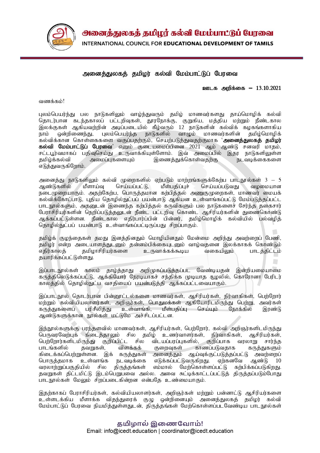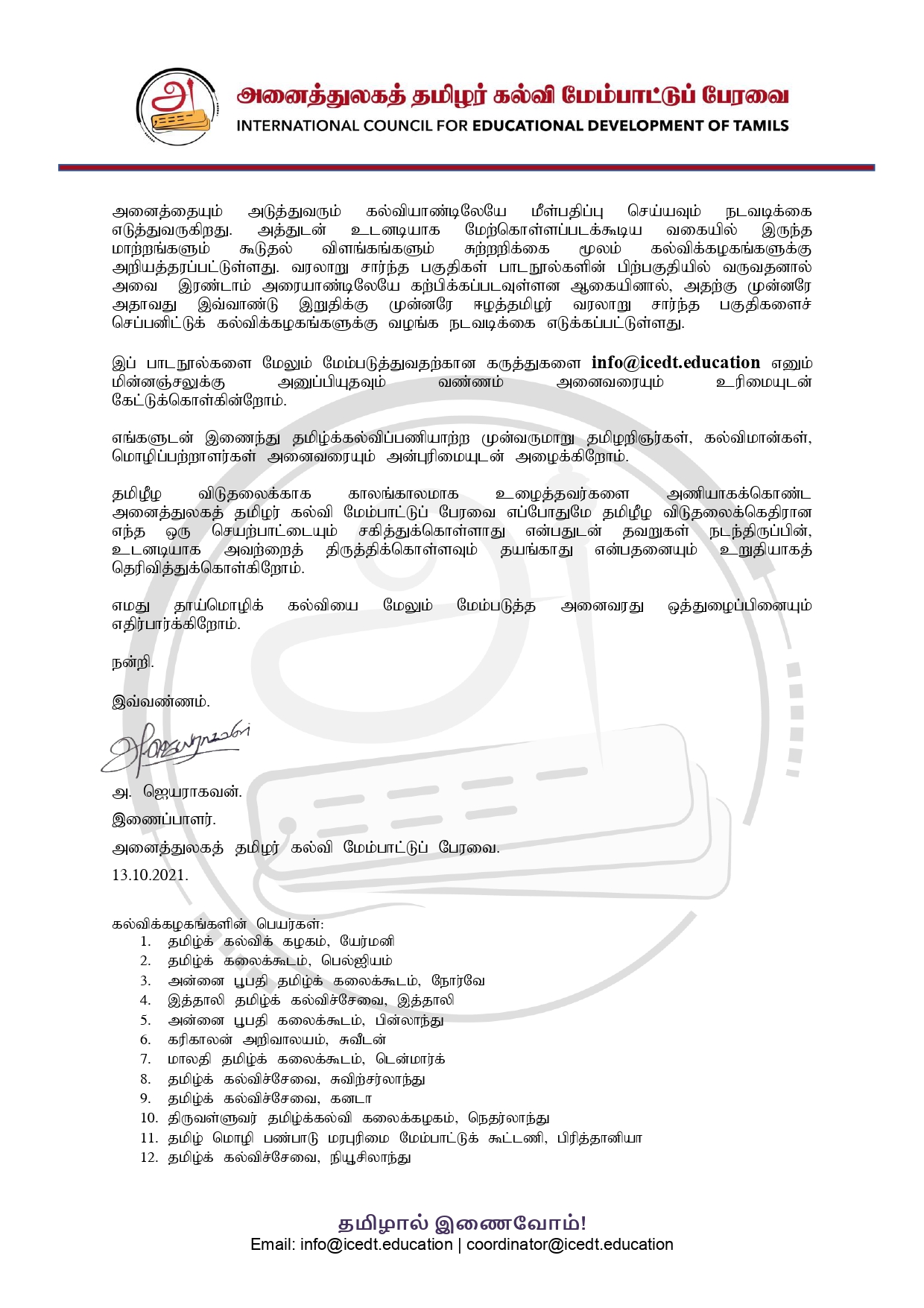 அனைத்துலக தமிழர் கல்வி மேம்பாட்டுப் பேரவையினால் வெளியீடு செய்யப்பட்ட தமிழ்மொழிப் பாடநூலில் பல திருத்தங்கள், இணைப்புக்கள் செய்யப்படவேண்டும் என பல தரப்புக்களும் வேண்டிக் கொண்டமைக்கிணங்க அவற்றினைச் சீர்செய்யும் நோக்கில் நூலாக்க விதந்துரைக்குழு ஒன்றினை உருவாக்கியுள்ளதோடு, முழுமையாக நூலாய்வு செய்யப்பட்டு மாற்றங்கள் செய்யப்படுமென உறுதிப்படுத்தி அனைத்துலகத் தமிழர் கல்விமேம்பாட்டுப் பேரவையினால் ஊடக அறிக்கை இன்று வெளியிடப்பட்டுள்ளது.