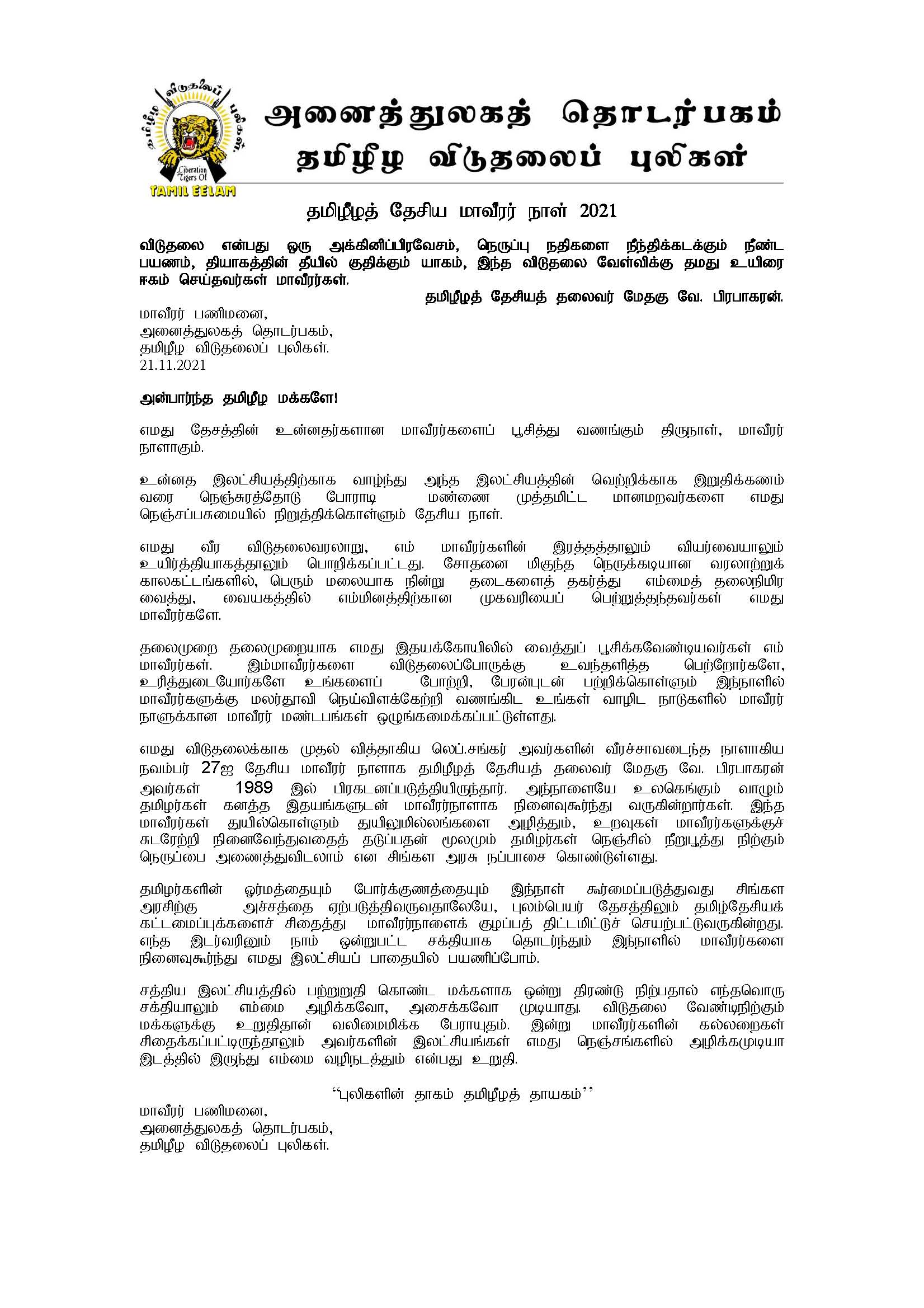 தலைமுறை தலைமுறையாக எமது இதயக்கோயிலில் வைத்துப் பூசிக்கவேண்டியவர்கள் எம் மாவீரர்கள். இம்மாவீரர்களை விடுதலைப்போருக்கு உவந்தளித்த பெற்றோர்களே, உரித்துடையோர்களே உங்களைப் போற்றி, பேரன்புடன் பற்றிக்கொள்ளும் இந் நாளில் மாவீரர்களுக்கு மலர்தூவி நெய்விளக்கேற்றி வணங்கிட உங்கள் வாழிட நாடுகளில் மாவீரர் நாளுக்கான மாவீரர் மண்டபங்கள் ஒழுங்கமைக்கப்பட்டுள்ளது.