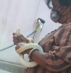இதனை அவதானித்த அந்த வீட்டுப்பெண் குறித்த பாம்பினை கையால் சர்வசாதாரணமாக பிடித்ததாக தெரிவிக்கப்படுகின்றது.