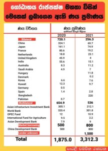 பாட்டலி சம்பிக்க ரணவக்கவின் தகவலின் பிரகாரம், 2020ம் ஆண்டு 1,875 மில்லியன் அமெரிக்க டொலர் கடன் தொகையும், 2021ம் ஆண்டு 3,312.5 மில்லியன் அமெரிக்க டொலர் கடன் தொகையும் இலங்கை பெற்றுக்கொள்ளப்பட்டுள்ளது.