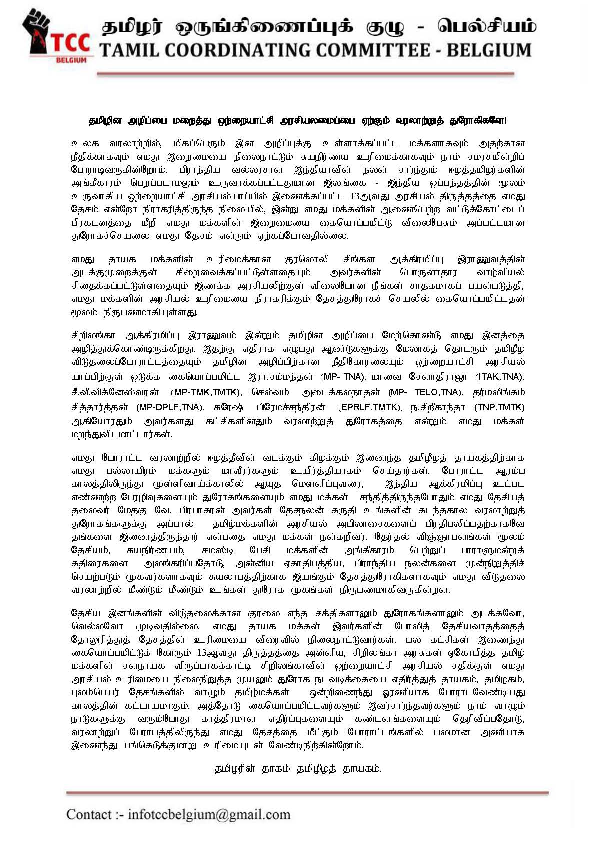 உலக வரலாற்றில், மிகப்பெரும் இன அழிப்புக்கு உள்ளாக்கப்பட்ட மக்களாகவும் அதற்கான நீதிக்காகவும் எமது இறைமையை நிலைநாட்டும் சுயநிர்ணய உரிமைக்காகவும் நாம் சமரசமின்றிப் போராடிவருகின்றோம். பிராந்திய வல்லரசான இந்தியாவின் நலன் சார்ந்தும் ஈழத்தமிழர்களின் அங்கீகாரம் பெறப்படாமலும் உருவாக்கப்பட்டதுமான இலங்கை – இந்திய ஒப்பந்தத்தின் மூலம் உருவாகிய ஒற்றையாட்சி அரசியல்யாப்பில் இணைக்கப்பட்ட 13ஆவது அரசியல் திருத்தத்தை எமது தேசம் என்றோ நிராகரித்திருந்த நிலையில், இன்று எமது மக்களின் ஆணைபெற்ற வட்டுக்கோட்டைப் பிரகடனத்தை மீறி எமது மக்களின் இறைமையை கையொப்பமிட்டு விலைபேசும் அப்பட்டமான துரோகச்செயலை எமது தேசம் என்றும் ஏற்கப்போவதில்லை……….