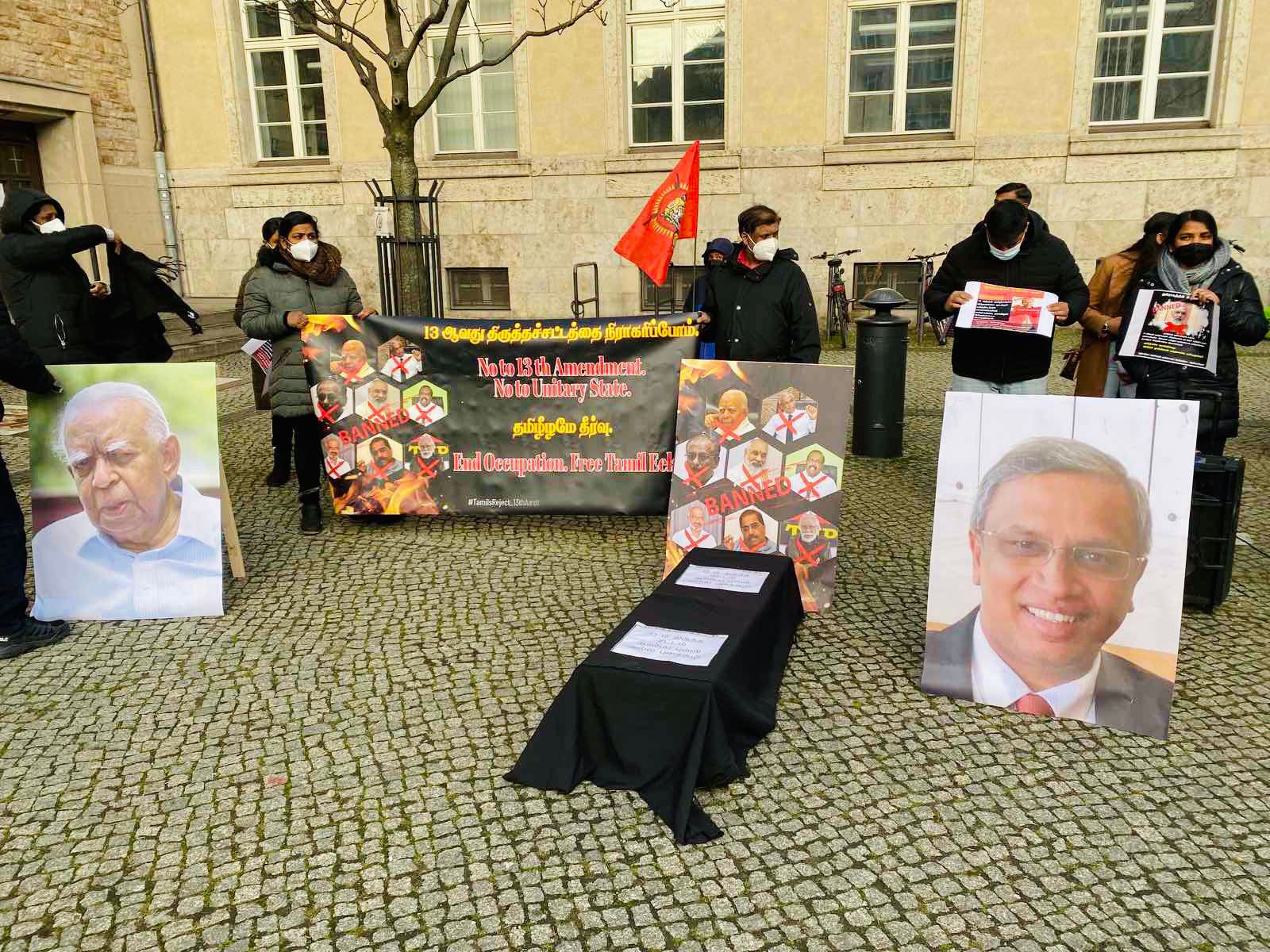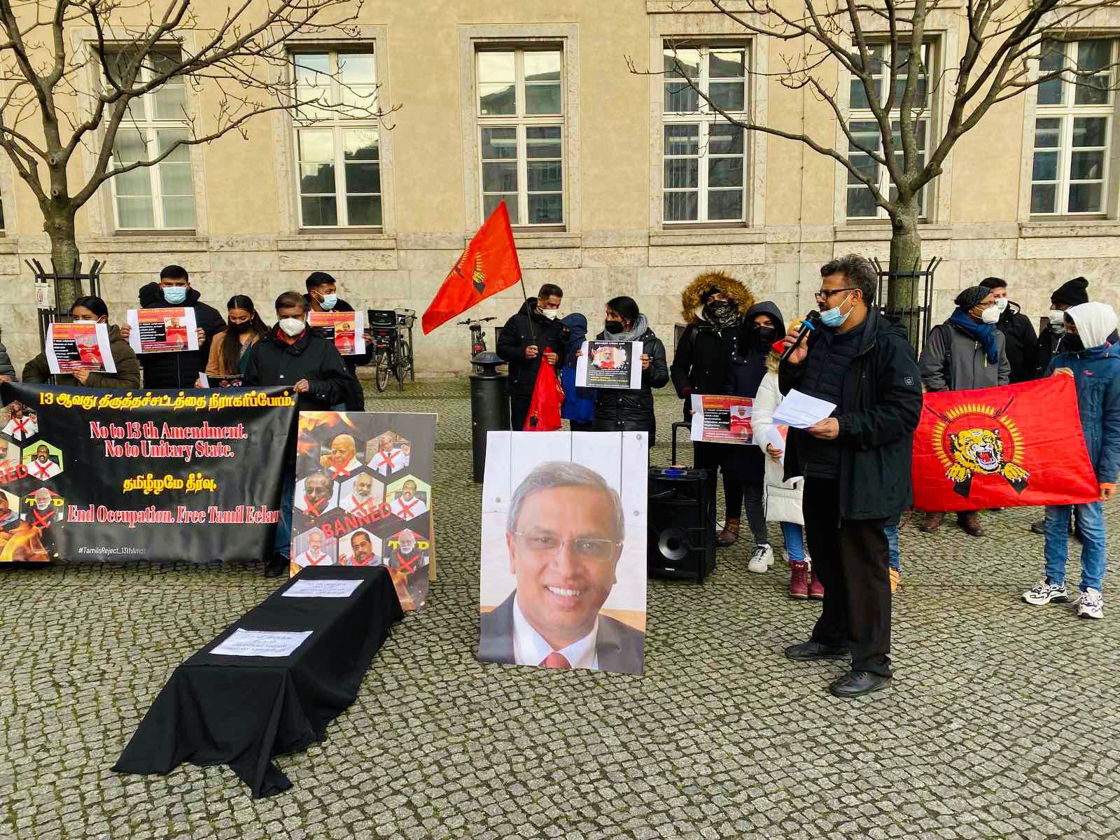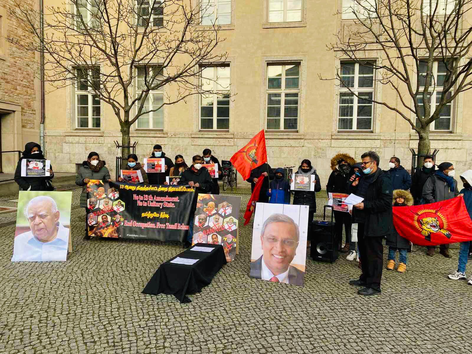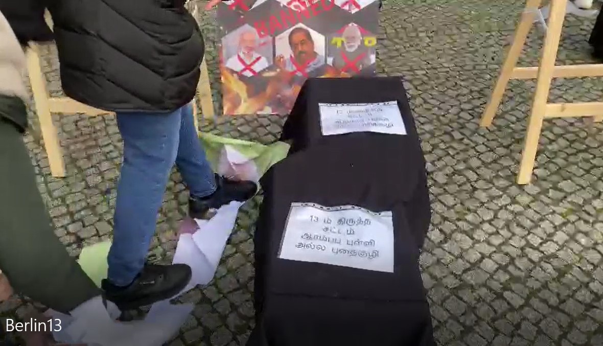 அந்த வகையில் இன்றைய நாளில் யேர்மன் தலைநகரில் 13ம் திருத்தத்தை அரசியற் தீர்வாக காட்டும் முயற்சிக்கு எதிராக கடும் குளிருக்கும் மத்தியிலும் இன உணர்வுடன் ஒன்றுகூடிய மக்கள் தமது கண்டணத்தை தெரிவித்தார்கள். தாயகத்தில் இருந்து மதிப்பிற்குரிய பாராளுமன்ற உறுப்பினரும் தமிழ்த் தேசிய மக்களின் தலைவரும் திரு கயேந்திரகுமார் பொன்னம்பலம் அவர்கள் இணையவழி ஊடாக கலந்துகொண்டு 13 ஆம் திருத்தமும் அதன் பின்னுள்ள கூட்டுச்சதியையும் மிகவும் தெளிவாக எடுத்துரைத்தார்.
