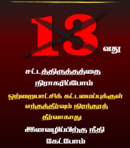 தமிழ் மக்களுக்கு பாதுகாப்பான, கௌரவமான அரசியல் தீர்வை முன் வைக்காமையினால் இனப்பிரச்சினை ஆனது 2009ஆம் ஆண்டு தமிழ் இனப்படுகொலையில் போய் முடிவடைந்திருக்கிறது. ஆகவே தமிழ் இனப்படுகொலை நடந்து 13 ஆண்டுகளுக்குப் பின்னரும் உப்புச்சப்பற்ற அதே 13 ஐ ஒரு அரசியல் தீர்வாக சில தமிழ்க் கட்சிகள் கோருவதானது, சிறீலங்காவின் ஒற்றையாட்சி அரச கட்டமைப்பை ஏற்றுக் கொள்வதாகவே பொருள் கொள்ளப்படும். தமிழ் இன அழிப்புக்கு ஊக்கமும் – சட்ட ஏற்பாடும் அளித்த, அளித்துக் கொண்டிருக்கிற ஒற்றையாட்சி அரசியல் யாப்புக்கு அங்கீகாரம் வழங்கும் ஒரு செயலாகவே இது பார்க்கப்படும். இந்த நடவடிக்கை தமிழ் மக்களின் சுயநிர்ணய கோட்பாட்டை கேள்விக்குள்ளாக்குகிறது.