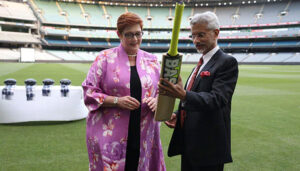 அவருடன் ஆஸ்திரேலிய வெளியுறவு மந்திரி மரிஸ் பெய்னும் சென்றிருந்தார். அப்போது விராட்கோலி கையெழுத்திட்ட கிரிக்கெட் பேட் ஒன்றை ஜெய்சங்கர் மரிஸ் பெய்னுக்கு பரிசாக வழங்கினார்