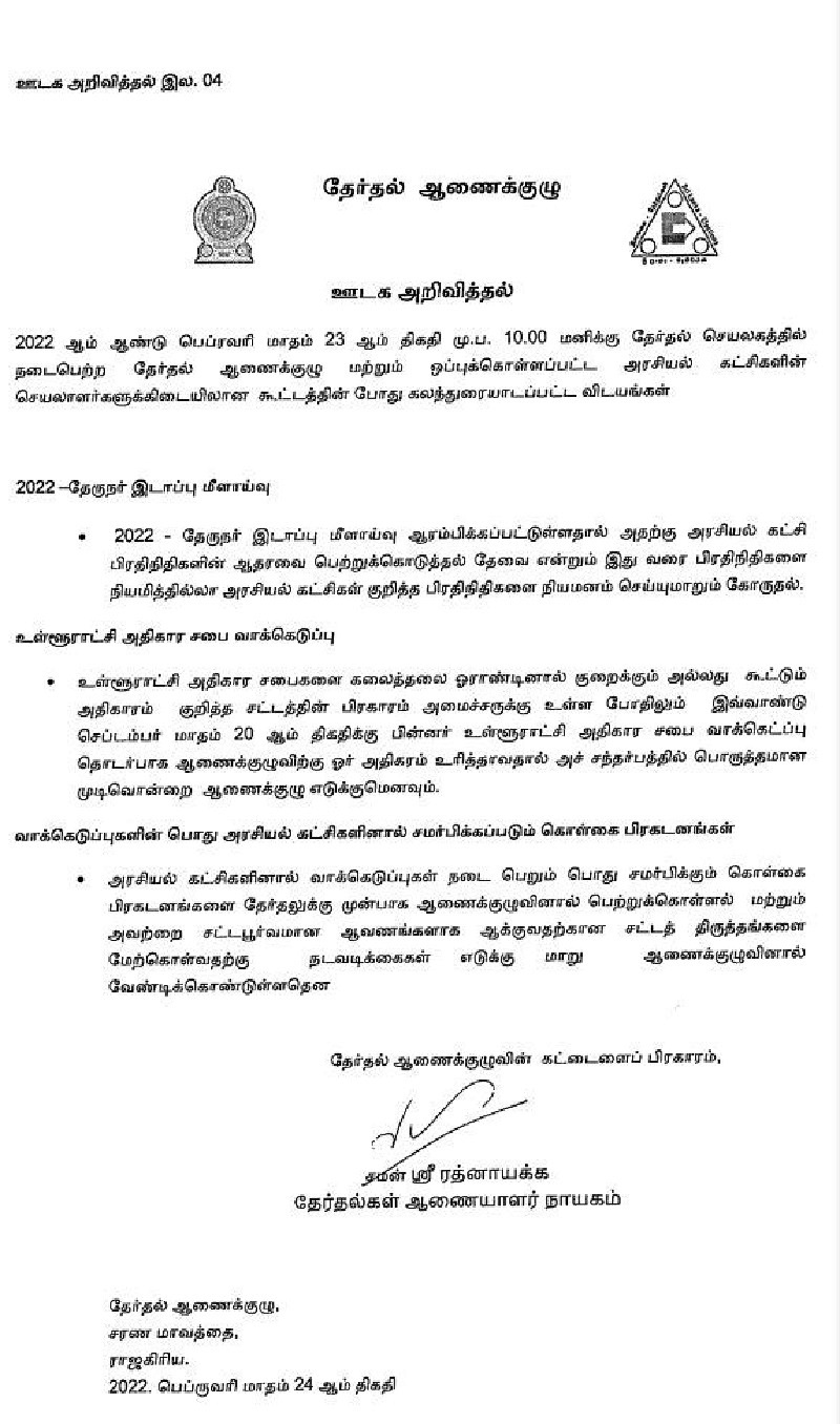கடந்த 23 ஆம் திகதி தேர்தல் செயலகத்தில் தேர்தல் ஆணைக்குழு மற்றும் அரசியல் கட்சிகளின் செயலாளர்களுக்கிடையில் நடைபெற்ற கலந்துரையாடலில் இந்த விடயம் குறிப்பிடப்பட்டுள்ளது.