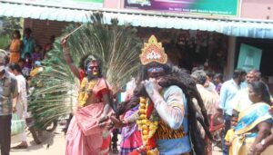 இன்று மதியம் அவர்கள் அம்மன் வேடமணிந்து ஆடு, கோழி, கடித்தபடி ஊர்வலமாக மயானத்திற்கு புறப்பட்டனர். அப்போது பொதுமக்கள் தங்களது வேண்டுதல்களை நிறைவேற்றும் வகையில் அவர்கள் செல்லும் வழியில் குறுக்கே படுத்து கொண்டனர்.