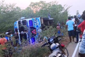 முல்லைத்தீவு பொலிஸ் பிரிவுக்குட்பட்ட முள்ளிவாய்க்கால் பகுதியில் தனியார் பஸ், வீதியை விட்டு விலகி கவிழ்ந்து விபத்திற்குள்ளாகியுள்ளது.