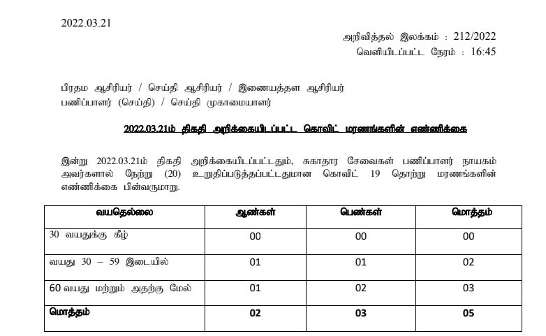 நாட்டில் நேற்று (20.03.2022) கொரோனா தொற்றால் மேலும் 05 பேர் உயிரிழந்துள்ளதாக அரசாங்க தகவல் திணைக்களம் தெரிவித்துள்ளது.