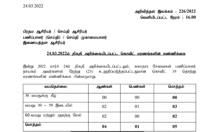 நாட்டில் நேற்று (23.03.2022) கொரோனா தொற்றால் மேலும் 05 பேர் உயிரிழந்துள்ளதாக அரசாங்க தகவல் திணைக்களம் தெரிவித்துள்ளது.