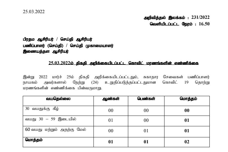 நாட்டில் நேற்று (24.03.2022) கொரோனா தொற்றால் மேலும் 02 பேர் உயிரிழந்துள்ளதாக அரசாங்க தகவல் திணைக்களம் தெரிவித்துள்ளது.