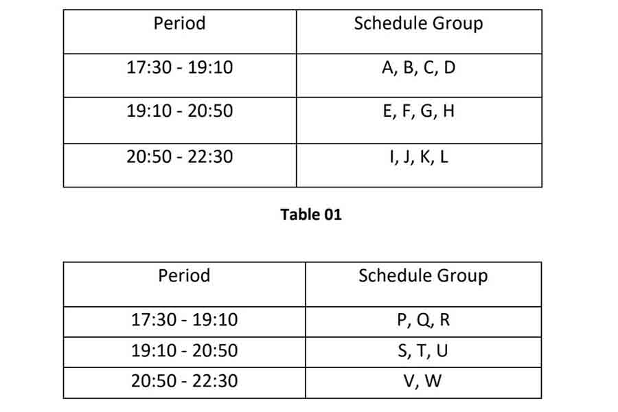ஏ முதல் எல் மற்றும் பி முதல் டபிள்யூ வரையான பிரிவுகளில் மாலை 5.30 மணி தொடக்கம் 10.30 மணி வரையான காலப்பகுதியில் 1 மணிநேரம் 40 நிமிடங்கள் மாத்திரமே மின்வெட்டு அமுல்படுத்தப்படவுள்ளது.