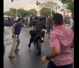 “எங்களை சுடுவதற்காக வந்தீர்கள்” என ஆர்ப்பாட்டக்காரர்கள் கோஷமெழுப்பினர். எனினும், கடமையிலிருந்த பொலிஸார், அந்த மோட்டார் சைக்கிள்களை திருப்பியனுப்பினர். ஆர்ப்பாட்டக்கார்களும் ஹூ சத்தமெழுப்பினர்.