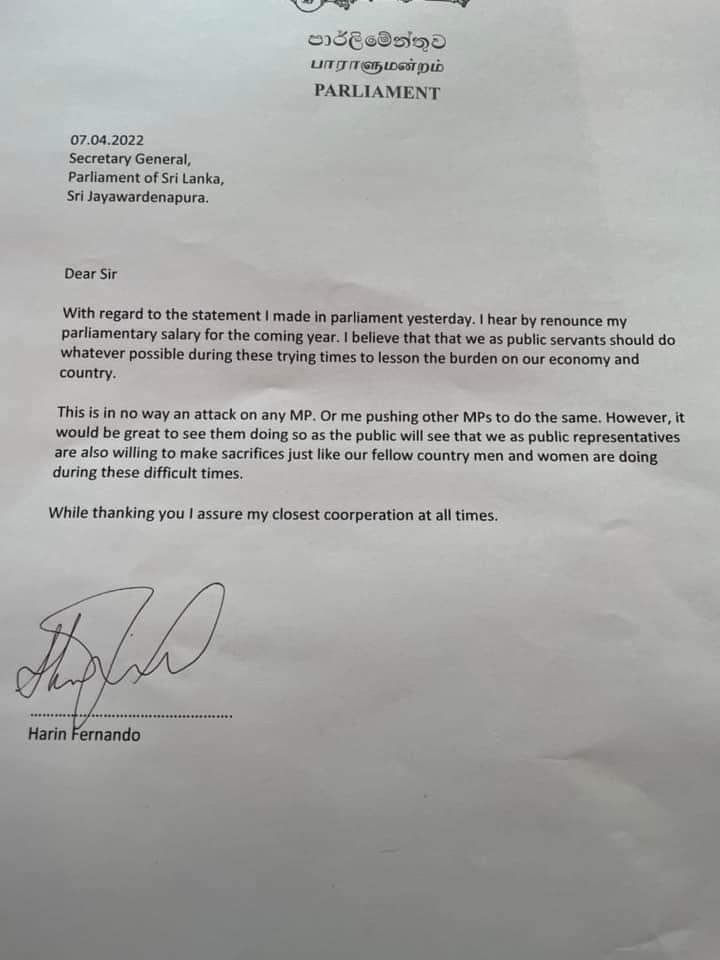 ஐக்கிய மக்கள் சக்தியின் பாராளுமன்ற உறுப்பினர் ஹரின் பெர்ணான்டோ, தன்னுடைய ஒரு வருடத்துக்கான சம்பளத்தை பெற்றுக்கொள்ளாமல் இருப்பதற்கு தீர்மானித்துள்ளார். இதனடிப்படையில், அதற்கான கடிதத்தை பாராளுமன்றத்தின் செயலாளர் நாயகத்திடம் கையளித்துள்ளார்.