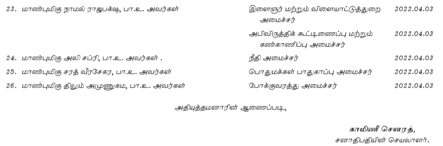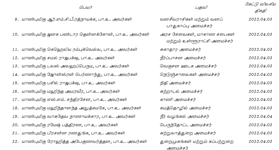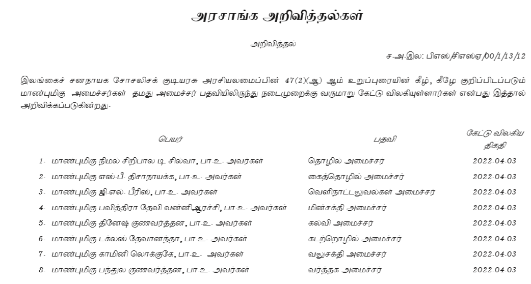 ஸ்ரீ லங்கா பொதுஜன பெரமுனவின் அரசாங்கத்தில் ஒரே நாளில், 2022.04.03 அன்று இராஜினாமா செய்த அமைச்சர்களின் பெயர் விபரங்கள் அடங்கிய வர்த்தமானி அறிவித்தல் வெளியானது.