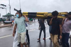 போராட்டக்காரர்களில் நான்கு, ஐந்து பேர் ஒன்றிணைந்து, அந்த இரும்பு கம்பிகளான தடுப்புகளை மிகவும் இலாவகமாக தூங்கிச்சென்று ஓரத்தில் வைத்துவிட்டனர்.