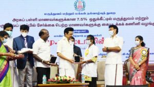 2021-22-ஆம் கல்வி ஆண்டில் மாநில ஒதுக்கீட்டில் அரசு மருத்துவக் கல்லூரிகள் மற்றும் சுயநிதி மருத்துவக் கல்லூரிகளில் 5,932 மருத்துவ பட்டப்படிப்பு இடங்களுக்கும், பல் மருத்துவத்தில் 1,460 இடங்களுக்கும் மாணவர்கள் சேர்க்கை பெற்றுள்ளார்கள். இவர்களுள் 7.5 சதவிகித ஒதுக்கீட்டில் 445 நபர்கள் மருத்துவப் படிப்பிலும், 110 மாணவர்கள் பல் மருத்துவப் படிப்பிலும் சேர்ந்துள்ளனர். இந்த மாணவர்களுக்கு இன்றைய நிகழ்ச்சியின்போது கையடக்கக் கணினிகள் வழங்கப்பட்டன.