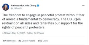 கைதுக்கு அஞ்சாமல் அமைதியான முறையில் போராட்டத்தில் ஈடுபடும் சுதந்திரம் ஜனநாயகத்தின் அடிப்படையாகும். அமெரிக்கா அனைத்து தரப்பிலும் கட்டுப்பாட்டை வலியுறுத்துகிறது மற்றும் அமைதியான எதிர்ப்பாளர்களின் உரிமைகளுக்கான ஆதரவை மீண்டும் வலியுறுத்துகிறது.’ என்று அவது தனது டுவிட்டர் பதிவில் மேலும் குறிப்பிட்டுள்ளார்.