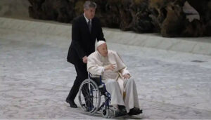 பொதுவெளியில் போப் பிரான்சிஸ் சக்கர நாற்காலியை பயன்படுத்தியது இதுவே முதல்முறை என்பது குறிப்பிடத்தக்கது.