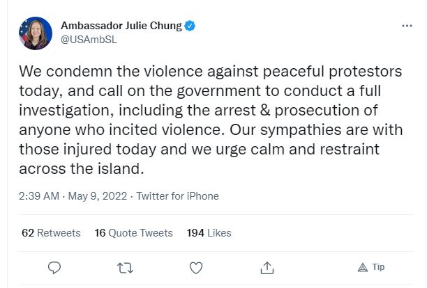 இது குறித்து இலங்கைக்கான அமெரிக்க தூதுவர் ஜூலி சங் தனது டுவிட்டர் தெரிவித்துள்ளதாவது,