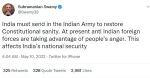 அமைதியான முறையில் ஆர்ப்பாட்டத்தில் ஈடுப்டடவர்கள் மீது நேற்று நடத்தப்பட்ட வன்முறைத்தாக்குதல்களை அடுத்து நாடளாவிய ரீதியில் அமைதியின்மை நிலையொன்று தோற்றம் பெற்றிருக்கும் நிலையில், அரசியலமைப்பு முறைமையை நிலைநாட்டுவதற்கு இந்திய இராணுவம் அனுப்பிவைக்கப்படவேண்டும் என்று பாரதிய ஜனதா கட்சியின் மூத்த தலைவர்களில் ஒருவரும் மாநிலங்களவை உறுப்பினருமான சுப்ரமணியன் சுவாமி தெரிவித்துள்ளார்.