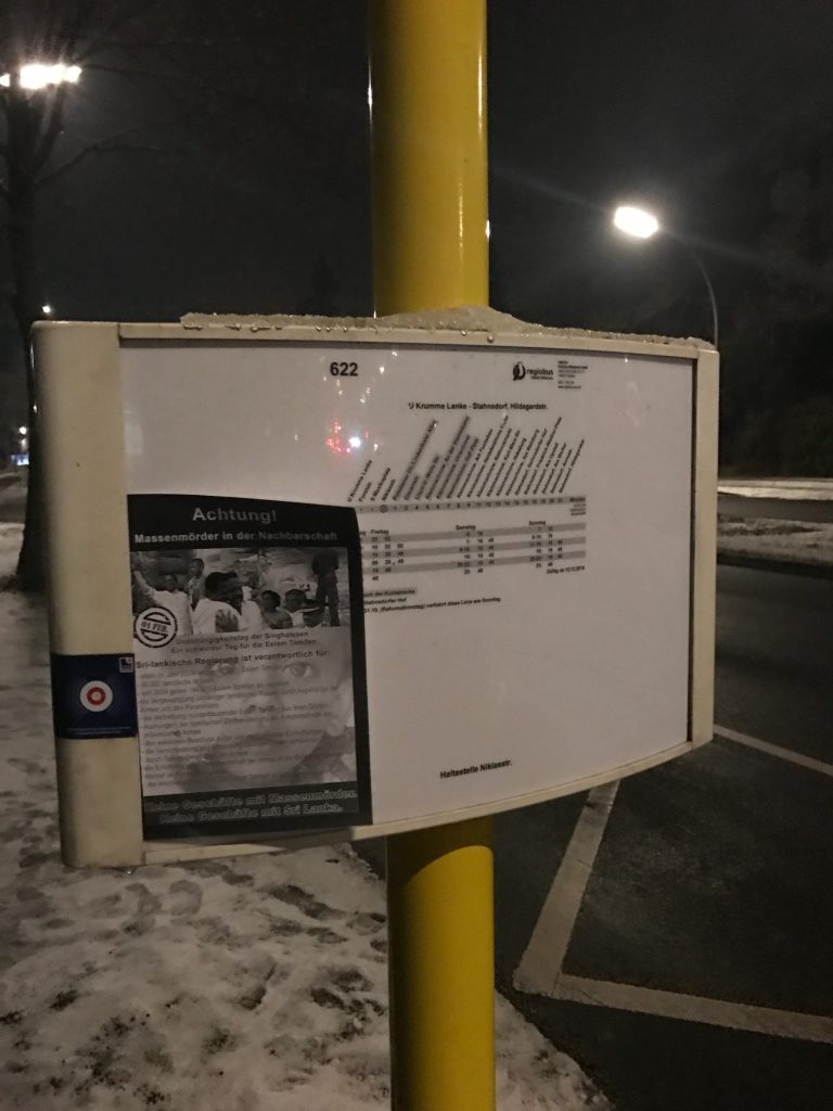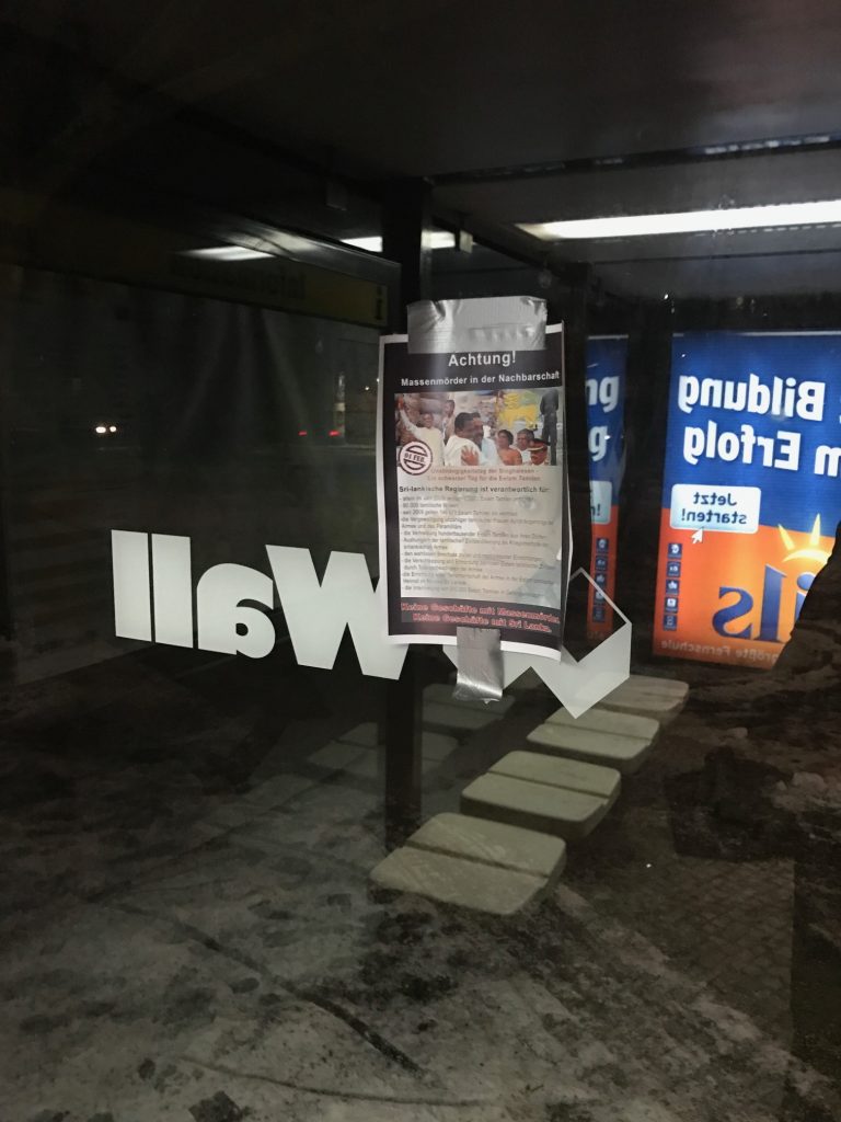 “நல்லாட்சியின்” பெயரால் எமது தேசிய அபிலாசைகள் குழிதோண்டிப் புதைக்கப்பட்டு கொண்டிருப்பதானது, எப்பாடுபட்டேனும் தமிழர்களை அழித்து தமிழர் தாயகத்தை கபளீகரம் செய்துவிடத் துடிக்கும் சிங்கள-பௌத்த பேரினவாதத்தின் முகத்திரையை கிழித்து நாம் வாழும் நாடுகளில் உள்ள வேற்றின மக்களுக்கு வெளிப்படுத்தும் வகையில் இன்றைய தினம் யேர்மனியில் பேர்லினில் அமைந்துள்ள சிறிலங்கா தூதரகத்தின் சுற்றுவட்டாரத்துக்கு வேற்றின மக்களுக்கு விழிப்புணர்வை ஏற்படுத்தும் முகமாக “கவனம் , உங்கள் அக்கத்தில் இனப்படுகொலையாளி ” எனும் கருத்துக்கு அமைய பல நூற்றுக்கணக்கான துண்டுப்பிரசுரங்கள் கடும் குளிரையும் பொருட்படுத்தாது தமிழின உணர்வாளர்களால் இன்று விநியோகிக்கப்பட்டது.