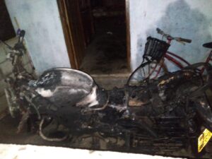 இதனை அடுத்து இரவு 12.30 மணியளவில் வெளியில் வந்து பார்த்தவுடன் மோட்டார் சைக்கிள் எரிந்துள்ளது.