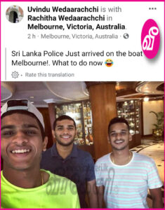 இந்நிலையில் அவர் தனது முகநூல் பதிவில் இலங்கை பொலிஸாரே நான் படகு மூலம் சற்றுமுன்னர் மெல்பேர்ன் வந்து சேர்ந்தேன் – தற்போது என்ன செய்வது என பதிவிட்டுள்ளார்.