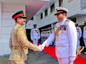 கடற்படை தலைமையகத்திற்குச் சென்ற இராணுவத்தளபதிக்கு கடற்படைப் பணிப்பாளர் நாயகம் (நிர்வாகம்) ரியர் அட்மிரல் பிரசாத் காரியப்பெருமவினால் வரவேற்பளிக்கப்பட்டது.