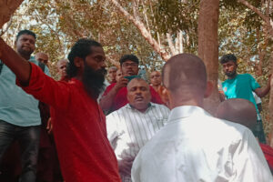 இதனாலே மக்கள் திரண்டு நீதிமன்ற தீர்ப்பை நடைமுறைப்படுத்துமாறு போராட வேண்டிய நிலைமை ஏற்பட்டிருக்கிறது. பொலிஸார் இந்த போராட்டத்திலே ஈடுபட்டிருந்த தவபாலன், சத்தியசீலன், கிந்துயன் ஆகிய மூன்று இளைஞர்களைக் கைது செய்து கடுமையாகத் தாக்கி கீழே போட்டு மிதித்து நெஞ்சிலே காலால் உதைத்து இலத்தியால் அவர்களுக்கு அடித்து மிக மோசமாகத் தாக்கியிருக்கிறார்கள்.