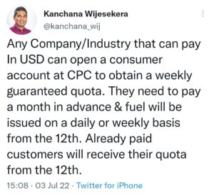 அமெரிக்க டொலரில் பணம் செலுத்தக்கூடிய எந்தவொரு நிறுவனமும் அல்லது தொழிற்துறையும் வாராந்த உத்தரவாத எரிபொருள் ஒதுக்கீட்டைப் பெறுவதற்கு இலங்கை பெற்றோலியக் கூட்டுத்தாபனத்தில் நுகர்வோர் கணக்கை ஆரம்பிக்க முடியும் என எரிசக்தி அமைச்சர் காஞ்சன விஜேசேகர இன்று அறிவித்துள்ளார்.