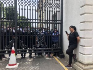 ;ஜனாதிபதி மாளிகைக்கு செல்ல முடியுமான அனைத்து பாதைகளும் கடந்த 3 மாதங்களாக வீதித் தடைகள் அமைக்கப்பட்டு நடமாட்ட கட்டுப்பாடுகள் விதிக்கப்பட்டுள்ளன. ஜனாதிபதி மாளிகைக்கு பொலிஸாரினதும், இராணுவத்தினரதும் ஒத்துழைப்புடன் மூன்றடுக்கு பாதுகாப்பு தொடர்ச்சியாக வழங்கப்பட்டுள்ளது.