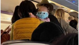 நியூசிலாந்தில் விமானம் ஒன்றில் எடுக்கப்பட்ட புகைப்படத்தில், ஒரு குழந்தையின் முகம் முழுவதும் முகக்கவசத்தால் முடப்பட்டு, கண்கள் வழியாகப் பார்ப்பதற்கு மட்டும் மாஸ்கில் சிறு ஓட்டைகள் இடம்பெற்றிருந்தது. அந்தப் படம் சமூக வலைதளங்களில் பெரும் விவாதத்தைக் கிளப்பியுள்ளது.