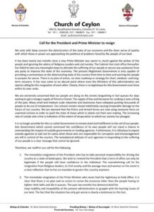 நாட்டை வங்குரோத்து நிலைக்கு இட்டுச்சென்றதற்கான தனிப்பட்ட பொறுப்பை ஜனாதிபதி ஏற்கவேண்டும் எனவும் திருச்சபை அறிக்கையொன்றில் தெரிவித்துள்ளது..