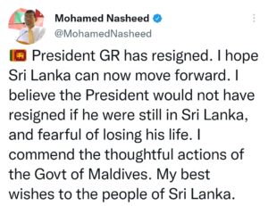 கோத்தபாய ராஜபக்ச ஜனாதிபதி பதவியிலிருந்து விலகிவிட்டார் என மாலைதீவின் சபாநாயகர் முகதட் நசீட் தெரிவித்துள்ளார் .