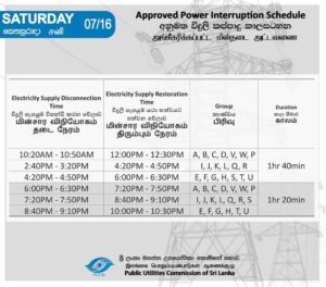 இன்று 16 ஆம் திகதி சனிக்கிழமை 3 மணி நேர மின்வெட்டு அமுல்படுத்தப்படவுள்ளதாக இலங்கை பொதுப்பயன்பாடுகள் ஆணைக்குழு தெரிவித்துள்ளது.